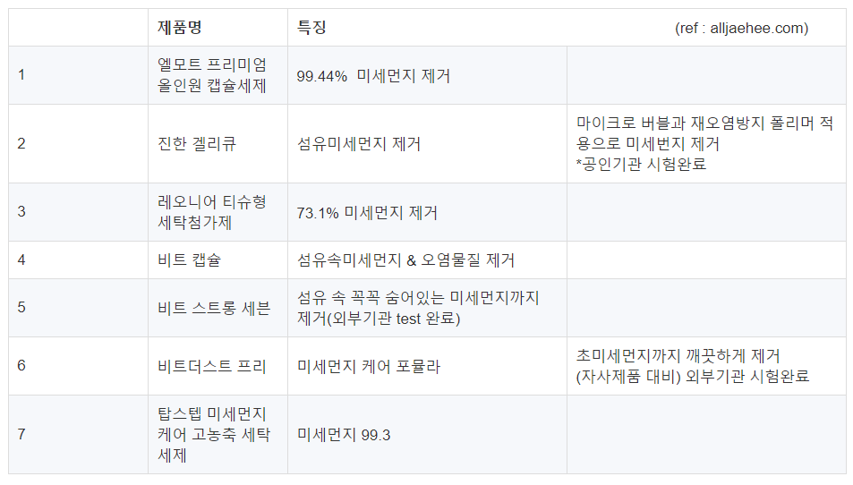 2024년 3월 기준, 미세먼지 세탁세제로 출시되어 있는 제품들의 종류와 특징을 정리해 보았습니다.