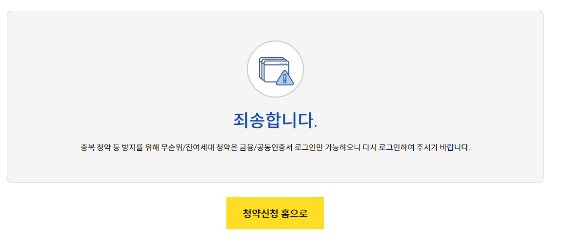 네이버 로그인을 하면 아래와 같은 메세지가 떠서 청약 진행이 되지 않습니다. KB국민 로그도 마찬가지 상황이나 참고하세요.
